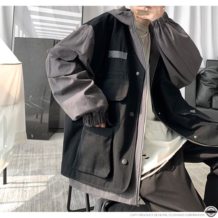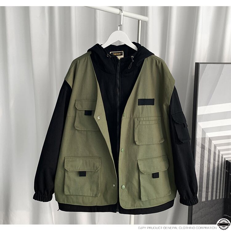 ジャケット ルーズフードスプリングオータムトップス 大きめサイズ 春物 秋物 ポケット多め マルチポケット ヒップホッププラスサイズ85771392961