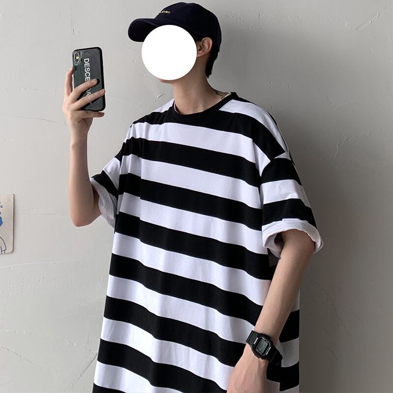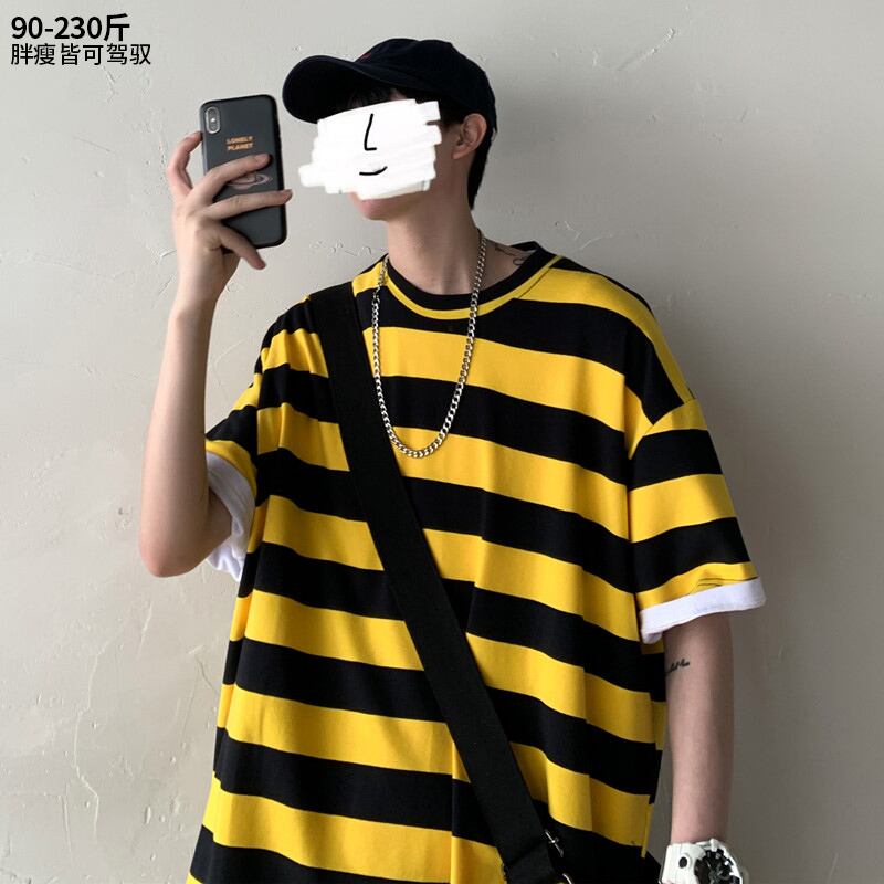 ストライプTシャツ ルーズラウンドネックサマー 大きめサイズ 夏物 Oネック ヒップホッププラスサイズ58956364979