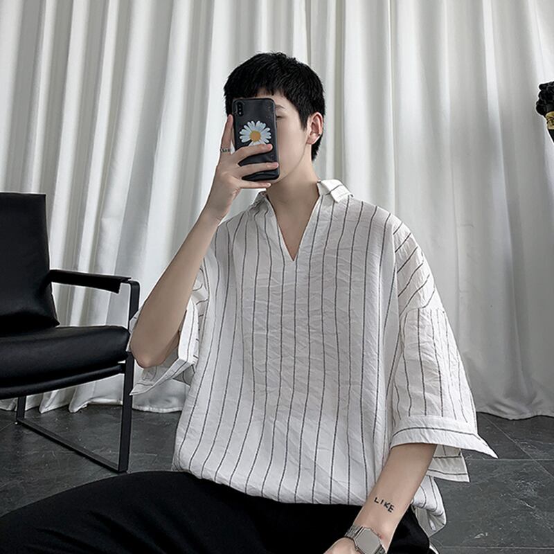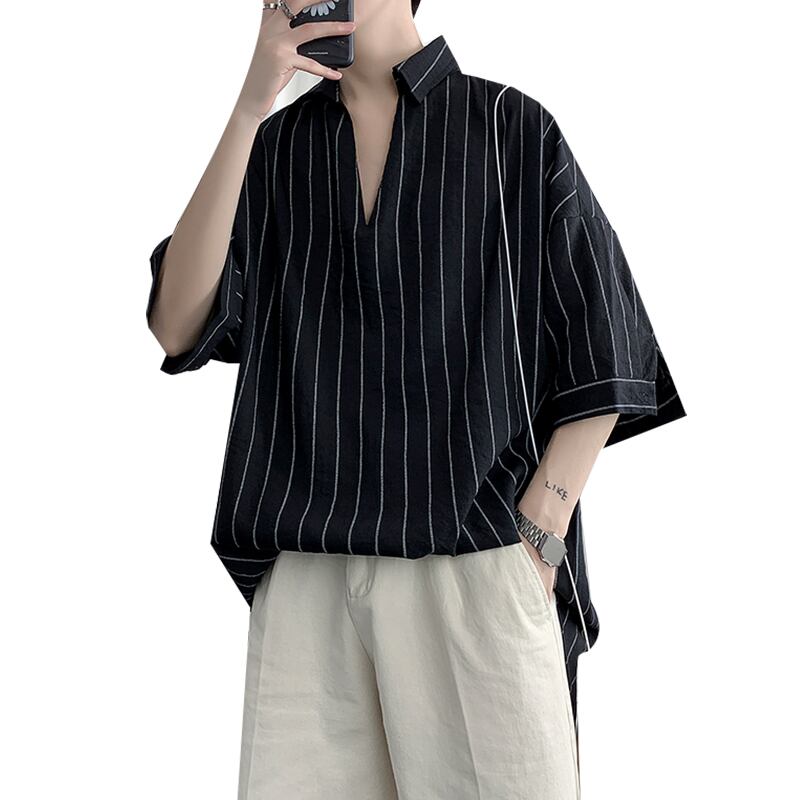 ストライプVネックシャツ サマールーズトップス 大きめサイズ 夏物 ヒップホッププラスサイズ80552011557